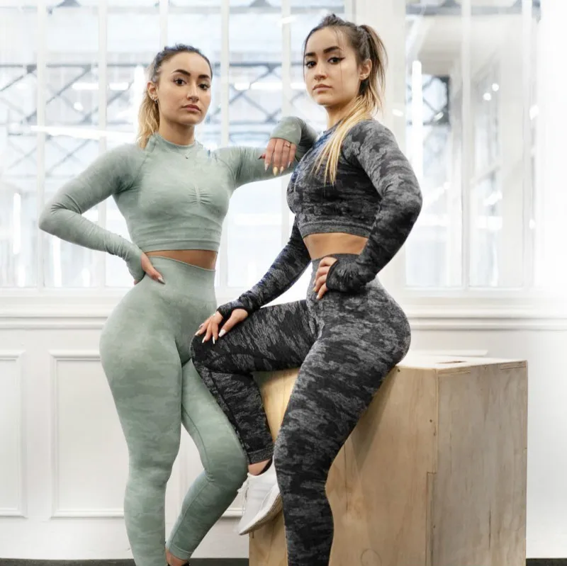 Aanzienlijke tijd is terwijl veel voorgesteld met betrekking tot Vrouwen Gym Yoga Set Sport Kleding Broek Shark Push Up Leggings + Lange Mouw Naadloze Running Hoge Elastische sportkleding.